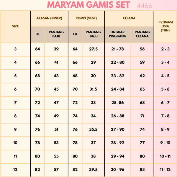 Estimasi usia hanya perkiraan. Mohon ukur badan anak terlebih dahulu (Lingkar Dada & Panjang Baju) untuk memastikan ukuran yang paling pas karena pertumbuhan setiap anak berbeda.